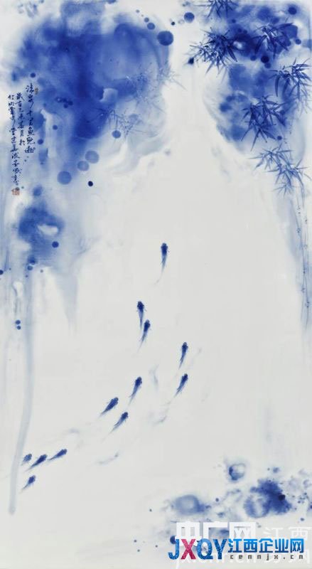 何建华的作品《清泉十里鱼儿游》,与其说浓墨勾勒的是边际,不如说显现的是经纬。画中以泼墨青花成水、分水成鱼,细致处勾线,虚渺处流釉。层层叠叠的晕染下是酣畅淋漓的水墨,作品不乏层次感,远近虚实,构图寓意,无不错落有致,相映成趣。而游鱼的出现不仅有添补右方空白的作用,更有平衡上重下轻的平衡感。设色浓而不艳,典雅清丽, 构图简明新颖,表现出一定的装饰效果,画面意境被这些流淌的青花釉料营造得飘逸、灵动。