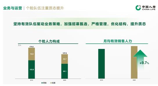 在人力规模方面,个险队伍实现逆市而上,行业第一且量质并生,2020年销售人力达到137.8万人,期中2020年收展队伍规模超过50万人,且成为个险新的增长点,诸多核心指标表现靓丽。